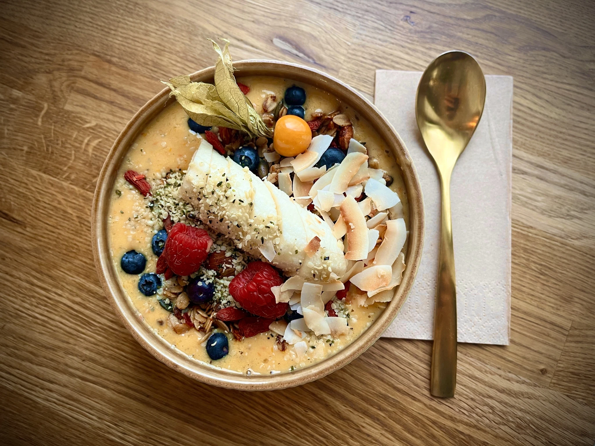 Meie enda valmistatud mandli-jõhvika granola, astelpaju, ingver, kaerapiim, banaan.